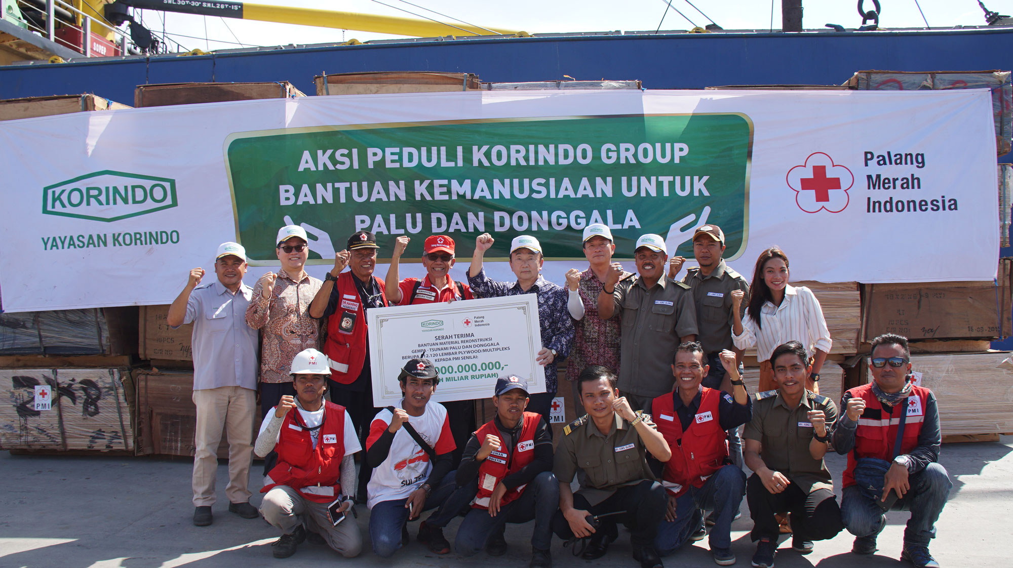 This aid was handed over directly by the Vice Chairman of KORINDO Group Mr. Kim Sang Jin accompanied by the General Secretary Yi Sun Hyeong to the Staff of Indonesian Red Cross (PMI) of Central Sulawesi at Port of Pantoloan, Palu.